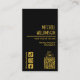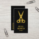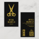 cartões de visitas na moda pretas para barbeiros e cabeleireiros com o seu nome e tesouros de chico na frente e mais detalhes no verso com as suas informações de mídia social, endereço, número de telefone e um Código QR tudo em letras douradas (não-metálicas). Personalize estas cartas para ser exclusivamente seu.