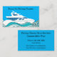 cartões de visitas de aventura de pesca de cartas em um design de moda com imagem de um barco na água na frente e seus contatos organizados atrás.