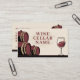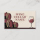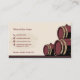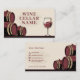 Um cartão de visita com ilustração dos barris e um copo de vinho de cor bege e burgata. Pode ser usado para um compro de adega, um vinheteiro, um sommelier, etc. Inclui horas de abertura no verso.