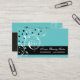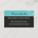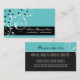 Beauty Salon elegante negro floral, cartões de visitas de chamas oculares turquesas, com folhas brancas de rolagem, espirais e remendos e pontos pretos sobre fundo aqua. Há uma banda preta com seu nome no fundo. Este design clássico e de moda é perfeito para um salão de beleza ou cabelo, estúdio de unhas, spa ou cosmética. É excelente para uso pessoal ou profissional.