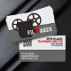 Film maker/director/Movie maker business cards, featuring a black vitage 35 mm movie style camera and the word “FILMAKER” with the M in red in the middle, on white and grey background. The back includes a QR code for more info.