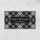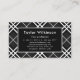 This elegant and modern business card features a black and white plaid background. The text combines modern sans serif fonts for a classy and sophisticated look.