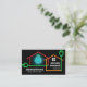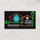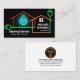 Um cobrir preto apresenta uma fiação elétrica criativa em casa que alimenta uma lâmpada azul ciano brilhante. No lado direito está seu nome prestigioso e cargo, com o nome comercial e os detalhes de contato próximos à base do cartão. No verso, em um cobrir branco, o logotipo da lâmpada elétrica dourada que você pode usar está no topo, seguido do seu nome, detalhes de contato e uma opção de slogan para divulgar seus serviços. Um design excelente para eletricistas.