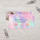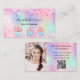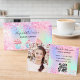 Um fundo holográfico rosa, roxo e verde de menta. Decorado com poeira e cupcakes brilhantes cor-de-rosa pincelada. Personalize e adicione seu nome e texto na frente. Voltar: Modelos para sua foto de perfil, nome, título, número de telefone, email e endereço do site, seu próprio código QR para seu site ou conta de mídia social.