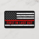 Cartões de visitas de bombeiro fino da linha vermelha - design de bandeira americana em cores de bandeira de bombeiro, design angustiado. Perfeito para todos os bombeiros e bombeiros. Frente - Personalize com nome, departamento, endereço e informações de contato. Voltar... "primeiro em último lugar". COPYRIGHT © 2020 Judy Burrows, Black Dog Art - Todos Os Direitos Reservados. Bombeiros Thin Red Line Premium Cartão de visita