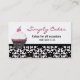 Cartão de visita feito sob encomenda elegante da padaria feito com um design preto e branco do damasco na parte inferior do cartão, e branco contínuo, na parte superior. Um cupcake preto, branco, e cor-de-rosa à moda, com a cereja na parte superior, decora a parte dianteira esquerda do cartão. O texto no rosa e no preto é inteiramente customizável serir suas necessidades do negócio. Aperfeiçoe para uma loja da padaria, a loja do partido, ou um padeiro feito sob encomenda independente.