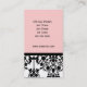Cartão de visita branco e cor-de-rosa preto elegante do damasco por Elke Clarke ©2009. Personalize com seus informação e logotipo do negócio. Pode igualmente ser usado como cartões do lugar, wedding inserções do convite para a informação ou os sentidos da recepção. Mais projeta disponível em strictlybusinesscards.blogspot.com. Customizável com sua cor da informação e do fundo.
