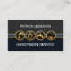 Uma simples design minimalista. Uma cinza e uma camada azul escura é demarcada por uma faixa azul perto do centro. Aqui está um conjunto de ferramentas de mão douradas que podem representar alguns dos serviços que você oferece. No topo está o seu nome prestigioso com o nome comercial "HANDYMAN SERVICE" na base. No verso, em um cobrir branco, no topo da placa está um logotipo de paisagem dourada que você pode usar. Seguiu-se o seu nome prestigiado, os detalhes de contato e uma opção de legenda de slogan. Um cartão de excelente para uso prático.