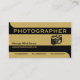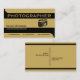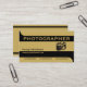 Câmera fotográfica cartão de visita preto, dourado, com câmera fotográfica preta em faixas de ouro e brancas e o texto "Fotografador". Um cartão de visita profissional de excelente para o ramo de fotógrafos ou fotografia e serviços.