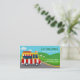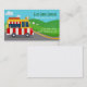 Um cartão alegre para um negócio do caminhão da comida com um caminhão colorido da comida em listras vermelhas e brancas na estrada com colinas verdes e fundo do céu azul.