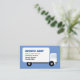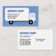 Um desenho simples de um caminhão de entrega está na frente do cartão. Seu nome comercial, slogan da empresa, nome, título e número de telefone são impressos no painel lateral do caminhão da caixa como se fosse pintado lá. O caminhão é branco com letras azul e pretas. O caminhão é desenhado num estilo minimalista, quase cartoon. Atrás do caminhão está um fundo azul claro sólido que acompanha a inscrição azul. As costas têm informações de contato adicionais. Bom para os seguintes tipos de empresas: transporte, entrega, transporte, logística, movimentação, transporte e qualquer outro negócio que use um caminhão grande.