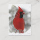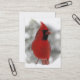 Este cartão de negociação artístico apresenta um brilhante cardeal vermelho. Ele é realmente o rei dos pássaros do quintal! Aqui ele está preso em um trilho de neve comendo sementes de girassol de óleo preto enquanto a neve de inverno gira ao seu redor.