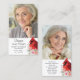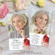 Compartilhe cartões de oração personalizados e personalizados com uma ou duas fotos, um cardeal com aquarela vermelha e flores cor-de-rosa, o título FOREVER EM NOSSOS CORAÇÕES em uma tipografia, nome e datas elegante e um poema ou substitua por seu próprio texto personalizado como recordação em um serviço de memorial de funeral ou Celebração da Vida. ASSISTÊNCIA: Para obter ajuda sobre modificação ou personalização do design, entre em contato com o designer ANTES DE ENCOMENDAR, por meio da guia MENSAGEM de bate-papo Zazzle abaixo ou envie um e-mail para makeitaboutyoustore@gmail.com.