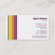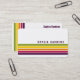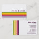 Um modelo de cartão de negócios com um motivo de faixa horizontal de cinco cores na frente com as mesmas faixas em execução vertical na parte traseira e alinhadas à esquerda. Nome na frente em letras de espaço duplo. O nome também é repetido no verso com o título/cargo e os detalhes de contato abaixo. Este modelo de cartão foi concebido principalmente para um indivíduo ou um freelancer que pode, evidentemente, ser mais personalizado e pode ser facilmente adaptado para outras utilizações.