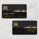 No verso, é utilizado o mesmo tema do design. A camada superior tem o logotipo dourado no topo e o nome comercial na faixa dourada. A camada preta por baixo abriga os detalhes de contato e o slogan.