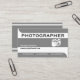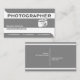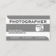 Cinza de câmera fotográfica, cartão de visita de captura de olhos brancos com uma câmera fotográfica em branco em cinzas e listras brancas e o texto Fotógrafo. Um cartão de visita profissional de excelente para o ramo de fotógrafos ou fotografia e serviços.