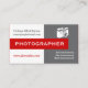Cinza de fotógrafo, cartão de visita branco, vermelho, flamejante, com câmera fotográfica em branco, sobre cinza branca, fundo branco e banda vermelha com o texto Fotógrafo. Um cartão de visita profissional de excelente para o ramo de fotógrafos ou fotografia e serviços.