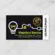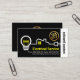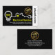 Um cobrir preto e branco em camadas apresenta um design de circuito de fiação elétrica criativo para casa. O circuito está extraindo energia do seu nome prestigiado no lado direito da placa em uma camada de stripe branca. Ao lado do seu nome há um logotipo dourado e que você pode usar. ; a letra-e pode representar "eletricista", seu nome prestigiado, nome comercial etc. Logo abaixo está o nome comercial em amarelo e seus contatos. No verso, o logotipo dourado está no topo seguido do seu nome prestigioso, dos seus dados de contato e de uma opção de legenda de slogan que você pode mudar para atender às suas necessidades de serviço. Esta é uma carta criativa feita para os eletricistas usarem. #eletricista #Electrical #electricalcontratante #eletroeletroreparador #eletroeletroreparador #eletroeletroeletrotécnico #light #bulb #plug #zazzlemade
