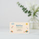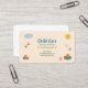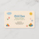 A pastel color business card for a child care service featuring playful elements. Colorful building blocks, cloud, smiling sun, and small handprints are scattered around the edges as decorative elements. It might work well for any activity involving children, including tutoring, nanny and babysitting.
