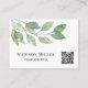 Este cartão de visita de verde moderno é perfeito para um proprietário de pequenas empresas, consultor, estilista e muito mais. A design botânica apresenta folhas de aquarela em tons de verde. Facilmente personalizável com seus detalhes e código QR. Use a Ferramenta Design para alterar o tamanho, o estilo ou a cor do texto. Original Watercolor © Michele Davies.