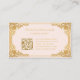 Um cartão de visita elegante que tem um quadro vintage com decorações barrocas falsas de ouro nos cantos. O plano de fundo é cor-de-rosa-claro. Na frente, o nome" é escrito em um roteiro caligráfico elegante. Todo texto é ouro, como o quadro dourado. Ele tem um código QR branco e ouro na parte traseira, à esquerda. O pano de fundo com as suas elegantes decorações barrocas é de uma coleção de cobrir franceses, de Georges Mercier (1885-1939) - Madame de Maupin por Theophile Gautier, volume 1, edição 1911, Paris - agora no dominio público.