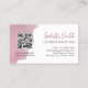 Elegante cartão de visita cor-de-rosa e branco para uma pequena empresa dentro da indústria da beleza ou da indústria de eventos, com seu nome de empresa, dentro um círculo simples com o site escrito em texto curvo ao redor do círculo. A cartão de visita de beleza é impressa para parecer como se mergulhada na cor-de-água rosa do pau-rosa. O outro lado apresenta seu código QR com o identificador de mídia social abaixo. Adicione seu nome em um script bonito com suas informações de contato abaixo.