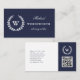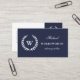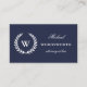 Monograma branco clássico de wreath em azul escuro, nome personalizado branco e profissão no lado frontal, informações de contato azuis no lado traseiro. Parece elegante, impressionante e caro. Adequado para muitos profissionais (advogado usado como exemplo).