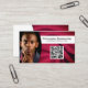 O tecido da Borgonha define o fundo deste design de cartão de visita com os marcadores de posição personalizados de foto e código QR na frente. O verso inclui um design coordenado e cores com campos de texto para o nome e os detalhes da empresa. Substitua a foto do marcador de posição pela sua fotografia e substitua o código QR pelo seu. Preencha os campos modelo ou clique em personalizar para selecionar um estilo de fonte, tamanho e cor desejados. Envie clientes potenciais para seu site, fotos, revisões ou outras ideias com o link de código QR.A foto do espaço reservado é cortesia em pixabay.com.