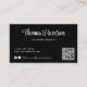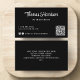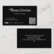 Cartão de visita de profissional preto elegante com seu nome ou marca apresentado em um roteiro branco na moda em negrito e um tipo de negócio ou título em letras brancas limpas. Introduza o endereço do Web site para criar um código QR que os clientes e clientes podem procurar numa lista dos seus produtos, serviços, horas, etc., e adicione as suas IDs de utilizador do instagram e do facebook para que os clientes sigam e se liguem a si nas redes sociais. Você pode adicionar informações adicionais na parte traseira ou deixá-la vazio.