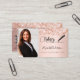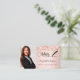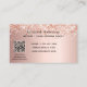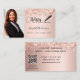 Um cartão de visita elegante e glamouroso sobre um fundo rosa dourado decorado com confete na frente e uma caneta de assinatura preta. Escrito elegante com letra manual. Personalize e adicione seu nome, texto, foto de perfil, informações de contato e seu próprio código QR ao seu endereço de site.