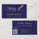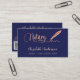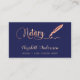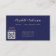 Um cartão de visita elegante sobre um fundo azul marinho e uma caneta de assinatura dourada rosa. Escrito elegante com letra manual. Personalize e adicione seu nome, título, informações de contato e seu próprio código QR ao seu endereço de site.