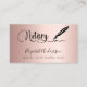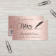 Um cartão de visita elegante e glamouroso sobre um fundo branco rosa dourado falso metálico e uma caneta de assinatura preta. Escrito elegante com letra manual. Personalize e adicione seu nome, título, informações de contato e seu próprio código QR ao seu endereço de site.