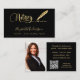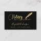 Um cartão de visita elegante e glamouroso sobre um fundo preto decorado com uma caneta falsa de assinatura dourada. Escrito elegante com letra manual. Personalize e adicione seu nome, texto, foto de perfil, informações de contato e seu próprio código QR ao seu endereço de site.