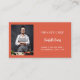 Um fundo colorido de terracota. Personalize e adicione sua foto, título, nome/nome comercial e texto, informações de contato na frente. Texto branco. Anterior: Modelos para o seu nome, título, número de telefone, correio e endereço do Web site, o seu próprio código QR para o Web site ou conta de suporte social. Ícones/conta do Facebook e Instagram.