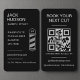 Faça uma primeira impressão corajosa com este elegante cartão de visita preto e prateado projetado para barbeiros, penteados e profissionais modernos do aliciamento. Apresentando um layout vertical, um ícone de polo de barbeiro minimalista e um código de QR digitalizável para reserva instantânea ou acesso social, este design é ideal para compras na moda, conectadas digitalmente. Totalmente personalizável com seu nome, informações de contato e identificador social.