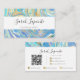 Um elegante e chico design de ouro brilhante falso, azul e tons de aqua todos se misturaram em um efeito líquido de mármore/derramamento de tinta. Este trabalho de arte foi feito para dar a sensação de geodes & mármore, ou uma tinta líquida derramando arte. O design é repetido na parte traseira da placa. A frente apresenta uma fonte de script cursivo personalizável para seu nome em preto e um local onde você pode adicionar seu título de trabalho. A parte traseira apresenta ícones de mídia social, assim como ícones de contato em uma textura de folha de ouro, e, clicando em "personalizar", você pode mover cada ícone individualmente. Esta placa também apresenta um novo modelo de código QR, no qual você pode adicionar seu próprio código QR para vincular ao seu site a sua página de mim, linktree, google list ou qualquer outro lugar para onde você queira direcionar seus novos clientes. Este cartão de visita é uma maneira muito chique e elegante de exibir suas informações comerciais, com seu design de mármore azul, aqua e ouro.