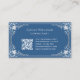 Um elegante cartão de visita azul que tem um quadro de vintage com decorações barrocas falsas de prata nos cantos. O fundo é azul clássico. Na frente, o nome" é escrito em um roteiro caligráfico elegante. O texto é branco ou cinza leve, quase branco. Ele tem um código QR azul e branco no verso, à esquerda. O pano de fundo com as suas elegantes decorações barrocas é de uma coleção de cobrir franceses, de Georges Mercier (1885-1939) - Madame de Maupin por Theophile Gautier, volume 1, edição 1911, Paris - agora no dominio público.