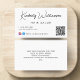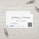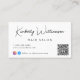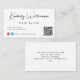 Cartão de visita personalizado chic com o nome ou a marca da sua empresa em um script de assinatura na moda e tipo de negócio abaixo, em caracteres simples e modernos. Introduza o endereço de URL do Web site para criar um código QR para que os clientes e clientes possam procurar uma lista dos seus produtos, serviços, horas, etc., e adicione as suas IDs de utilizador do instagram e do facebook para que os clientes o sigam nas redes sociais. Adicione informações adicionais na parte traseira ou deixe o vazio.