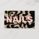 Uma fonte em negrito, em cor-de-rosa-claro, sobre um design abstrato assimétrico em preto. Esta versão tem um código qr no verso e é destinada a técnicos de unhas.