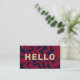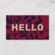 Alô em uma fonte em negrito em bege neutro, em um design abstrato assimétrico em azul marinho e vermelho borrado, esta versão tem um código qr no verso em preto.