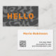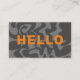 Olá, em uma fonte em cor de laranja, em um design abstrato assimétrico em médio retrô e cinza escura, esta versão tem um código qr no verso.