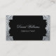 Um cartão de visita elegante que tem bordas vintage esquerda e direita com decorações prateadas falsas antigas. O fundo é preto. Na frente, o nome "é escrito em uma caligrafia elegante. Todo o texto é cinza prateado, como as bordas. Tem um código QR no verso, à esquerda.