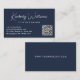 Cartão de visita profissional elegante e mínimo azul escuro com seu nome em um moderno roteiro branco-na moda e em sua empresa, título e informações de contato em tipografia branca simples e limpa. Introduza o endereço URL do Web site para criar um código QR pesquisável. No verso, personalize o texto adicional ou deixe o vazio.