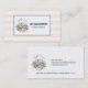Cartões profissionais com um fundo listrado de pêssego e um quadro em camadas no topo. Projetado com uma ilustração criada com aquarelas. Um coelho bonito vestindo um vestido azul sentado em uma cesta cercada por seus ovos. Borboletas à volta da cesta que é decorada com um buquê de flores de rico.