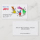 Estes cartões de visitas coloridos e bonitos caracterizam um trio da figura brilhante crianças da vara da aguarela que funcionam, saltando, e fazendo um handstand. O texto no lateral diz a "parte a ALEGRIA" no vermelho azul e brilhante. Está abaixo o texto preto que você pode facilmente personalizar para anunciar seu próprio negócio relativo criança. A parte traseira do cartão tem três campos do texto adicional para sua personalização. Aperfeiçoe para uma pré-escolar, escola primária, ou o negócio do centro de dia, entre outros. Alegre e divertimento!