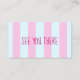 Ilustração bonita e desenhada à mão de um copo de sorvete de morango com palitos de chocolate e rodeada de morangos em círculo branco. O fundo é um azul fresco de menta. Seu nome de compro está escrito em uma tipografia rosa-giratória. Suas datas são escritas em uma tipografia simples correspondente. A parte de trás mostra listras em rosa e azul. Você tem a possibilidade de escrever uma nota para seus clientes.