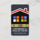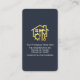 Um cartão moderno profissional e criativo. Design apresenta um prédio criativo no telhado com janelas coloridas. Seu nome prestigiado está em uma faixa de ouro com os detalhes de contato e uma legenda de slogan que você pode mudar, perto da base. No verso, em uma cobrir escura, sobre o topo está o logotipo dourado "ferramentas manuais caseiras" que você pode usar. A isto segue-se o seu nome prestigiado, os dados de contato e a opção de legenda do slogan. Um cartão de visita para empreiteiros gerais, um trabalhador a usar. #empreiteiro de construção #empreiteiro geral #construção #homerepair #edifício #construtor #handyman #handymantools #remodelação #renovação #zazzlemade