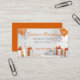 Este cartão de visita é adequado para promover os serviços de contratação de sala de funções. O design na moda apresenta um balão laranja e prata e design de presente. Fácil de personalizar com detalhes comerciais de função de seu próprio partido.
