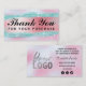 Uma tela cor-de-rosa e azul em um plano de fundo holográfico para o seu obrigado para compra ou pedido de seu cliente.