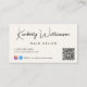 Cartão de visita de creme leve com o nome da sua empresa ou marca em um script de assinatura na moda e tipo de negócio em simples inscrições modernas. Introduza o endereço de URL do Web site para criar um código QR para que os clientes e clientes possam procurar uma lista dos seus produtos, serviços, horas, etc., e adicione as suas IDs de utilizador do instagram e do facebook para que os clientes o sigam nas redes sociais. Você pode adicionar informações adicionais na parte traseira ou deixar o vazio.